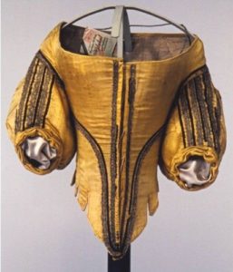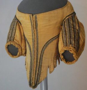 Confectionné en satin de soie jaune et doublé de lin léger et de futaine, ce corsage présente un laçage dissimulé au centre devant. Très ajusté, il est entièrement rigidifié par une doublure à baleines. La robe possède une large encolure ovale, une jupe pointue sur le devant et de courts panneaux de franges rapportés, sur lesquels était initialement cousue la jupe assortie. Les manches mi-longues, froncées en profonds plis tubulaires au dos, se terminent par d’étroits poignets froncés. Une bordure de dentelle aux fuseaux en métal orne le corsage. Le motif géométrique de cette dentelle est composé d’arches d’argent, chacune surmontant un carré d’or. Ces arches étaient reliées par un carré d’argent surmonté de deux carrés d’or décalés. Un fin galon noir tissé accompagne la bordure de dentelle. Ces finitions soulignent encore davantage l’élégance des lignes le long des coutures courbes des pièces avant et arrière.