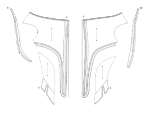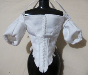 Il s’agit d’un corsage conservé en Allemagne et dont le relevé du patron est disponible dans la réimpression de la thèse de Johannes Pietsch, “La collection de costumes Hüpsch au Musée d’État de Hesse à Darmstadt : Catalogue des vêtements masculins et féminins. Études sur les matériaux, les techniques et l’histoire du vêtement au XVIIe siècle”.